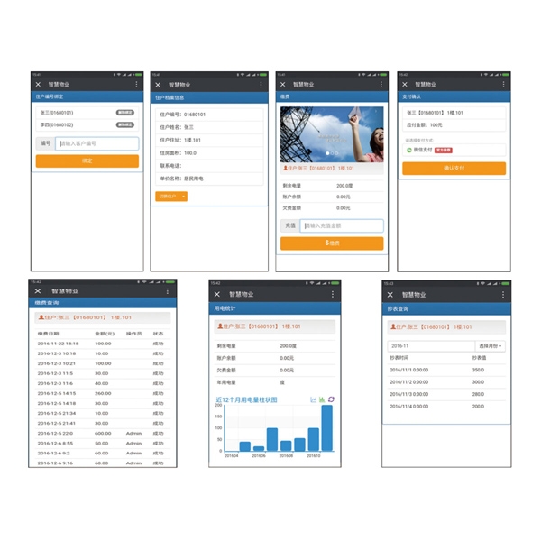 ●實現(xiàn)微信在線自助繳費。 支付方式支付微信支付。查詢近6個月的繳費記錄。統(tǒng)計顯示近12個月的用電量信息。歷史抄表記錄查詢。